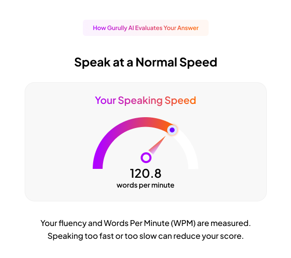 Tracks spoken word volume and timing exactly like Pearson’s system (does not affect the score directly but improves accuracy). This feature measures -How many words you deliver per unit of time. While this metric itself does not directly contribute to your score, it is extremely important for two reasons: